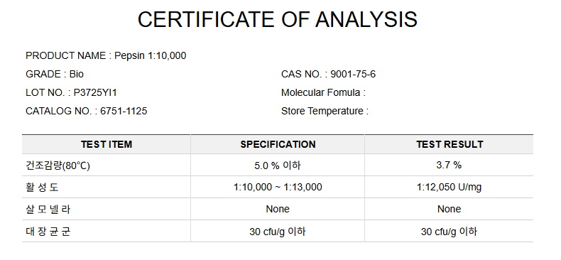- 시약의 경우 예상 순도는 일반적인 수치이며 배치(batch)별로 다를 수 있습니다. 예상 순도와 합리적인 범위 내의 차이가 있는 경우, 이는 사양에 부적합한 것으로 간주되지 않습니다.